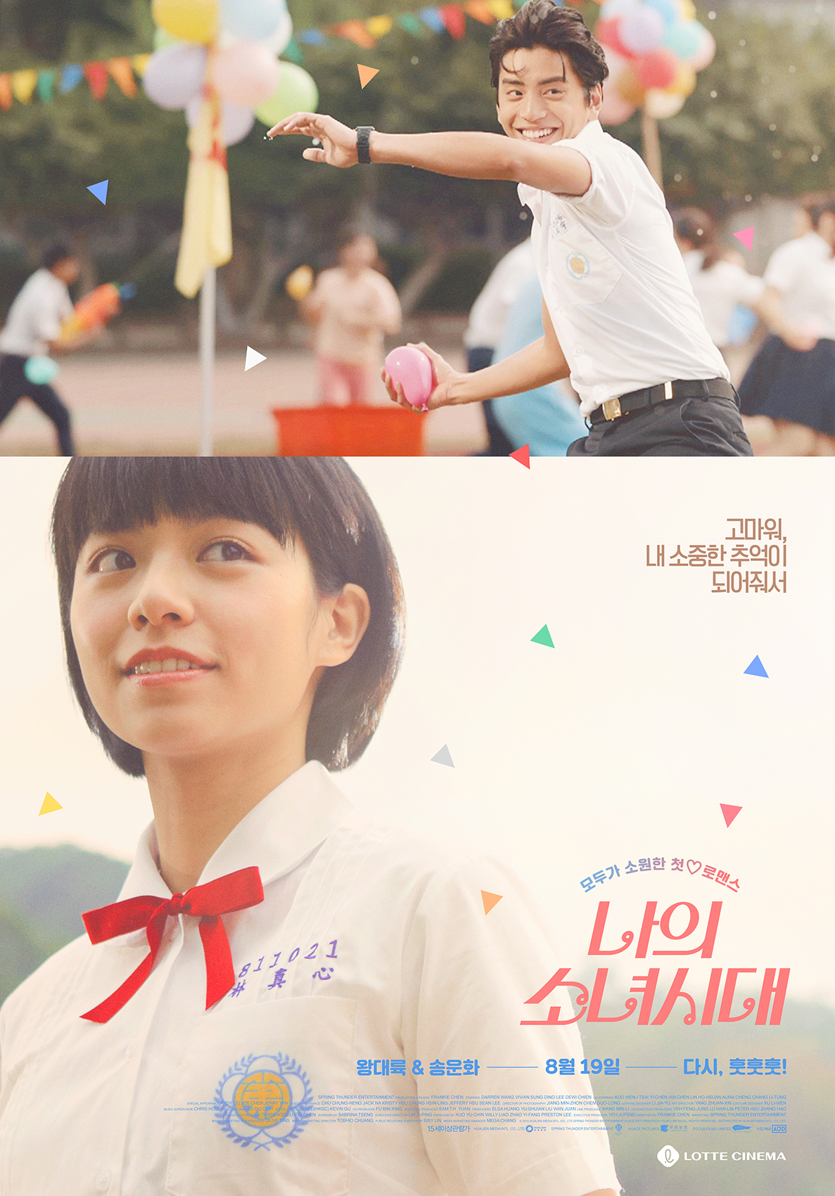 2020년 다시 한번, 나의 소녀시대! 2016년 개봉해 41만 관객을 돌파하며 대한민국을 뜨겁게 달군 프랭키 첸 감독, 왕대륙, 송운화 주연의 <나의 소녀시대>가 2020년, 8월 19일(수) 롯데시네마에서 단독 재개봉을 전격 확정했다. 1차 예고편 공개와 동시에 폭발적인 반응을 얻으며 여름 극장가, 또 한번의 싱그러운 ‘나소시’ 열풍을 예고한 가운데 소환 포스터 역시 상큼 터지는 비주얼로 관람 욕구를 높인다. [수입/배급: 오드(AUD) l 감독: 프랭키 첸 | 주연: 왕대륙 ♥ 송운화]
