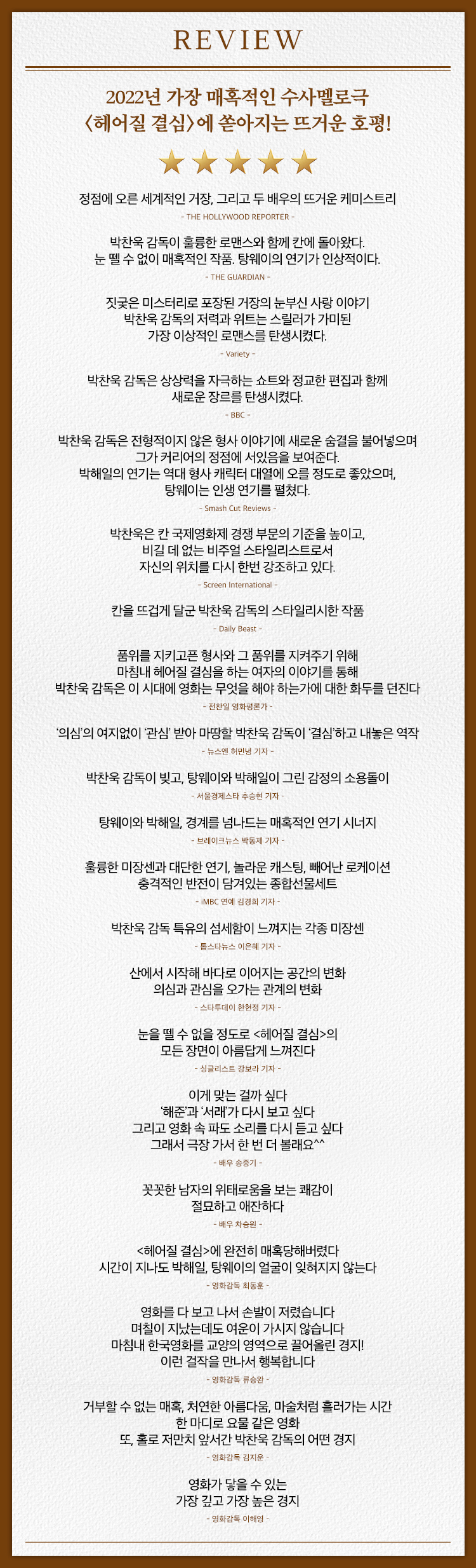 박찬욱 감독과 탕웨이, 박해일의 첫 만남, 그리고 수사극과 멜로극이 결합한 독창적 드라마에 감각적인 미장센이 더해진 영화 <헤어질 결심>은 전국 극장에서 절찬 상영 중이다.